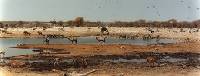 | Om 8:00 weg. Het was weer zonnig. Onderweg was alles erg dor, doods en grijs van het stof. Zelfs de olifanten waren niet zwart, maar wit van het stof. Bij de drinkplaatsen hebben we weer veel dieren gezien (Giraffe, Zebra, Impala, Jakhals, Struisvogel, Gnoe, Dikdik, Springbok, Wrattenzwijn, Gier en Olifant). 's Middags gegeten op de kampeerplaats Halali, waar we ook even gezwommen hebben. Omstreeks 15:45 waren we op de camping, alwaar we weer zijn gaan zwemmen. Ook nog even een lekkere pint gepakt. Na het eten zijn we naar de verlichte waterplaats op de camping gegaan, waar 2 Neushoorns zaten te drinken. Nadat wij zijn weggegaan is volgens anderen een kudde Olifanten gekomen, die de Neushoorns wegjaagde. | |