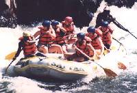 | Sandra, Ingrid, Richard, Elise, Paul, Aethne, Suzanne, Raimond, Erik, Erik, Dale en Mart zijn gaan raften op de Zambezi. Eerst met de truck naar Zambia, alwaar instructie werd gegeven over het raften. Daarna met de trucks naar de watervallen, naar rapid #1. Ingrid, Richard, Elise, Paul, Raimond en Mart zaten in ÚÚn rubberbootje samen met een ander Nederlands/Duits echtpaar. Sandra, Aethne, Suzanne, Erik, Erik en Dale zaten in een ander rubberbootje met twee Zuid-Afrikanen. Het ging allemaal lekker tot aan rapid #7 : Gullivers Travels. Daar sloeg onze boot in het begin al om. We verloren daar een paar personen, die in andere boten terecht kwamen. Vervolgens viel het grootste gedeelte van de personen in onze boot nog eens een keer uit de boot. Mart was vervolgens opgesloten onder de boot en kon geen adem halen. Gelukkig kon die er tussendoor duiken. De hele bemanning van de boot was bijzonder over hun toeren en het kostte moeite om weer op een normale manier verder te gaan. Gelukkig kwam de lunch er al bijna aan. Na rapid #10 zijn het Nederlands/Duits echtpaar uitgestapt. De rest van de ploeg heeft nog even overwogen om te stoppen, maar we zijn verder gegaan. Na rapid #11 kregen we de lunch en konden we bijkomen van het avontuur. 's Middags ging het langzaam aan beter, doordat we weer enig zelfvertrouwen kregen. De "kapitein" nam gelukkig steeds de eenvoudigste oplossing door de stroomversnellingen heen. Aan het eind van de rit (na rapid #21) mochten we nog even een "stukje" omhoog klauteren tegen een berg, met een wel zeer merkwaardige houten trap. Om 18:30 waren we terug op de camping.