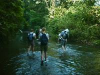 | Om half 5 opgestaan en om 5 uur ontbeten. Om half zes op de pickup naar de startplek van de alternatieve Corcovadotrekking. De wandeling klonk op papier wel te doen. Eerst een poosje door het bos. Dan een klimming van een uur. Weer een tijd lang door het bos. Een tijdje door de rivier en daarna een flinke afdaling. Het eerste stuk ging lekker snel. Op een gegeven moment moeten we even van schoenen wisselen, oftewel de wandelschoenen uit en de waterschoentjes aan. Even een paar keer de rivier passeren/doorlopen. Daarna weer schoenen wisselen en weer verder doorlopen. Tot de lunch ging het lekker snel. Een uur voor op schema. Wel een bui onderweg, maar dat maakte eigenlijk toch al weinig uit, aangezien we toch nat van het zweet waren. Tijdens de lunch de shirtjes even uit om uit te wringen en in de zon te drogen. Daarna weer lekker doorstappen. Bij wat goudzoekers langsgeweest en daarna een lange tijd door de rivier lopen. Er kwamen steeds steentjes in m¦n schoenen dus dat liep niet echt lekker. En het tempo daalde dan ook wat. Het zogenaamde vlakke stuk door het bos was toch ook veel stijgen en af en toe wat dalen. Uiteindelijk toch de beloofde afdaling, En wat voor ÚÚn! De gids kapte stokken uit, zodat we allemaal wandelstokken hadden. Dat was behoorlijk nodig want de afdaling was gemiddeld zo¦n 45 graden. Poeh he. Dat was toch wel even schrikken. Een soort van skipiste, maar dan op losse ondergrond. Gelukkig geen modder, want we zitten in de droge periode. Bij een watervalletje nog even wat gerust en daarna op weg naar het strand, voor een strandwandeling van een half uur. Met een blik op oneindig, maar gewoon doorgelopen en zo snel mogelijk naar het restaurant van de lodge voor een lekkere koude pils. Na een half uurtje de tent opgezocht en wat gedoucht. Daarna wat eten en zo snel mogelijk naar bed. Een lekkere lange dag.
