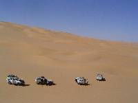 | Vanochtend eerst naar het museum van Germa geweest met daarin wat rotstekeningen en andere interessante info. Er waren zowaar ook wat borden in het Engels, zodat je nog enigszins kon begrijpen wat het was. Daarna nog een stukje over de asfaltweg, alvorens we bij zeer hoge zandduinen kwamen. Daar eerst nog even geluncht en gewacht tot het iets koeler was, zodat er over het zand gereden kan worden. Daarna begon het achtbaan spektakel. Met grote snelheid over het losse zand rijden, om genoeg vaart te krijgen om behoorlijke heuvels te nemen. Dat lukte regelmatig niet, zodat er geschakeld moest worden, een stukje achteruit gereden moest worden, om vervolgens weer een nieuwe poging te doen. En als je dan boven was, dan was het af en toe lekker stijl naar beneden. Ik was op dat moment ook even niet zo blij dat ik voorin zat. Dan speelt die hoogtevrees toch wel even op. Maar even de ogen dicht doen, rustig adem halen en dan komt het allemaal vanzelf wel goed. Na een tijdje wordt het zelfs wel leuk op een bepaalde manier. Alleen moet die dan niet al te scherp de bochten nemen, want dan ben je toch bang dat hetzelfde gebeurd als met die andere jeep. De aangepaste zijwaartse schaal van Ludo moest dan ook worden ontwikkeld. De schaal van Ludo is bedacht door een van de reisgenoten, genaamd Ludo (goh), die een soort van afgeleide schaal van Richter is, maar dan voor bultjes op de weg met hun impact op de reizigers. Bij 8 wordt het hoofd gestoten, bij 10 licht de achterste passagier op de voorbank en bij 12 licht de auto op de kop en kan niet meer rijden. Maar onze chauffeur was duidelijk ervaren genoeg en bedreven om de boel goed in de gaten te houden. Hij had nog tijd om in de spiegels naar de anderen te kijken. iets wat een aantal chauffeurs toch zelden deed. Nog vrij snel twee meertjes/oases bezocht, alvorens we een stuk zand op zochten dat we kampeerplaats zouden noemen. De laatste nacht in de tent. Toch wel een vreemd gevoel eigenlijk.