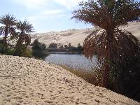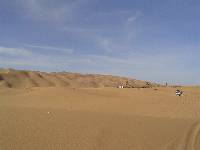 Daarna nog een stukje achtbaan gepakt in de zandduinen. Het was er nu wat drukker, zodat we op een gegeven moment echt recht op een groep mensen tussen twee wagens heen af reden op een top. Die konden nog wel wegspringen, zodat we door konden rijden. Toch wel spectaculair zo'n woestijntocht. Uiteindelijk weer bij de asfaltweg terecht gekomen bij een soort van camping. Daar konden we douchen en ditmaal op stoelen zittend onze laatste lunch van onze meegereisde kok proeven. Daarna afscheid genomen van onze toearegs omdat we met taxi(bussen) naar Sebha terug werden gebracht.