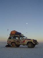Daarna op naar de zoutvlakte. Eerst een stop bij bergjes waar men het zout liet drogen. Daar een bijzondere groepsfoto gemaakt met iedereen bovenop zo'n hoopje. Toen snel doorrijden naar "het" zouthotel. Dat wil zeggen het eerste zouthotel wat ze daar ooit hadden wat nu een soort van restaurant is. Ondertussen hebben ze er meerdere gebouwd aan de rand van de zoutvlakte. In eentje daarvan hebben wij geslapen. Deze lag aan het noorden van de vlakte, in de buurt van de plaats Tahua. Een erg basic overnachtingplaats, met zeven slaapkamers voor 3 personen. Die nacht werden alle stelletjes opgesplitst en werden het aparte dames en herenkamers. In de jeep was ook een kokkin mee (met zoontje). Die zorgde 's avonds (en 's ochtends en 's middags) voor het eten. Een gemeenschappelijke badkamer met twee toiletten, die je mocht doorspoelen door er een emmer water in te gooien. Eigenlijk best wel vertrouwd. Net zoals Kootwijk. De stroom werd geregeld met een generator, die 's avonds om kwart over tien uit ging.