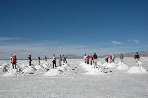 Het reisgezelschap op de zoutvlakte van Uyuni (Bolivia)